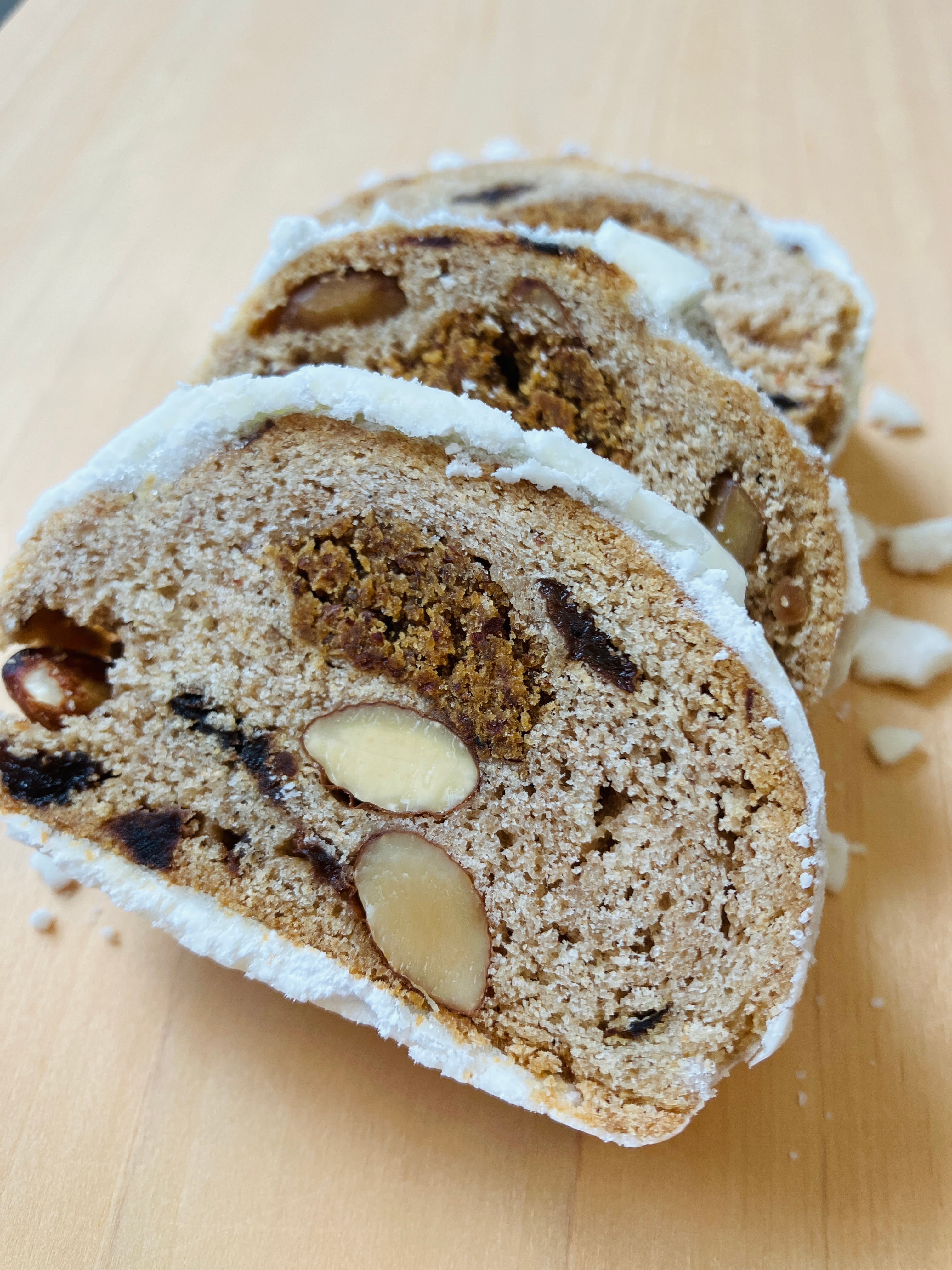 シュトーレンは、切り分ける際に周りのお砂糖のコーティングが崩れますが、バターを吸った美味しいお砂糖ですので